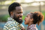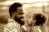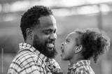 Happy african black parents dad father with daughter child on piggyback teasing fun in garden greenhouse. Black daughter kiss cheek dad and neck riding in vegetable greenhouse garden in light sunset