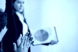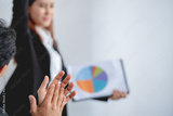 Teamwork applauding clap congratulating promoted greeting for win woman Speaker present document to boss and meeting team decide. coworker coach explain Analysis Statistics graph presentation