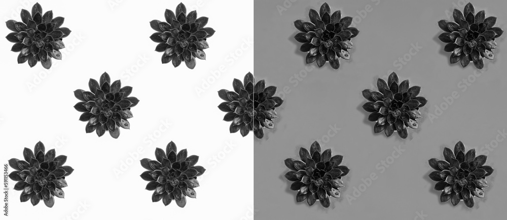 Collage. Black cactus on the white and gray background. Pattern. Flat lay. Top view.