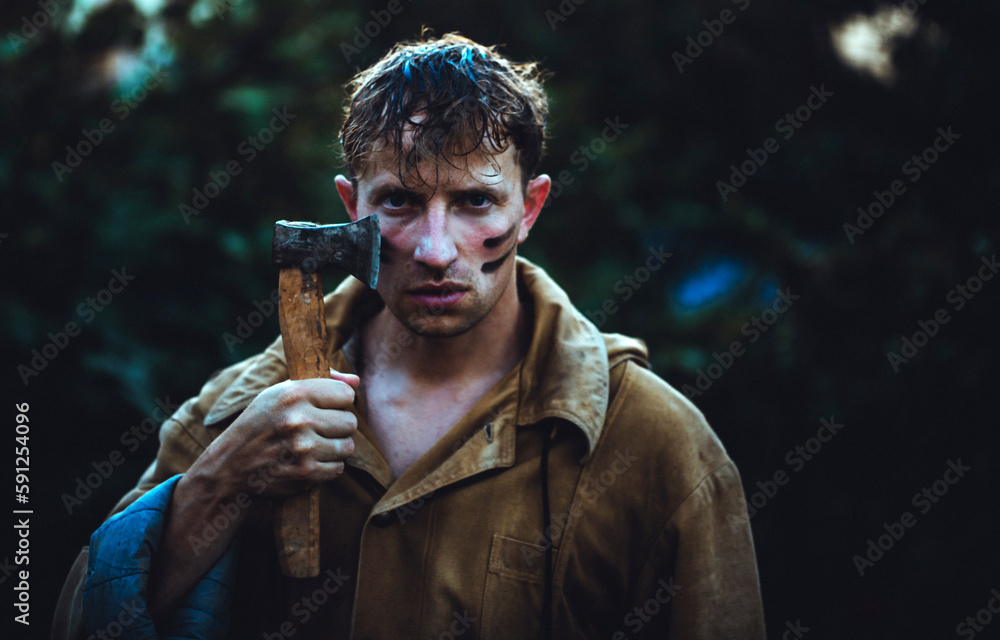 Lumberjack carry ax. Bald woodsman. Harvest firewood. Hike vacation. Hike in forest. Forest care. Determination of human spirit. Man checkered shirt use axe. Brutal male in forest. Power and strength.
