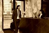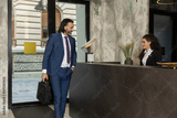 Businessman talking to the receptionist at the hotel reception