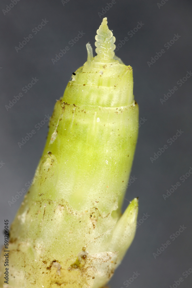 Wheat ear, cereal early stem elongation, beginning of stem elongation. BBCH stage 30-31. Growth stages of cereals.