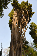 An old cypress tree with multiple trunks, which are holding, like hands, sunlit crown of evergreen foliage. Somewhere in labyrinth of alleys in National, or Royal Garden, Athens, Greece. Nature.