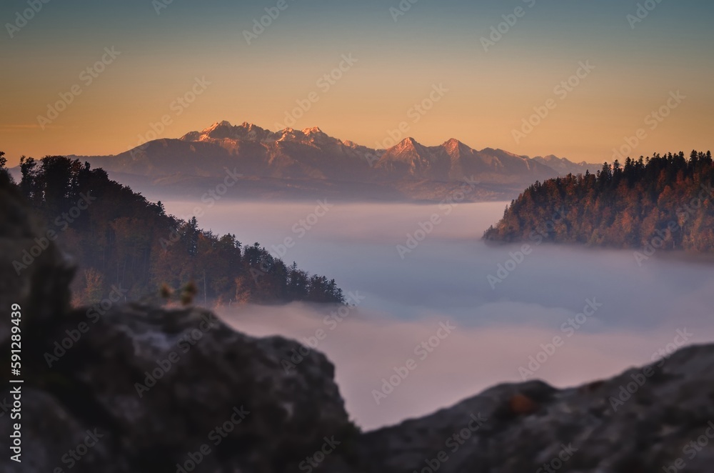 Fabulous colorful autumn landscape. Magical morning in the Polish mountains. Photo taken on top of Sokolica in Pieniny, Poland.