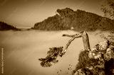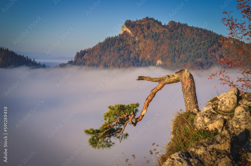 Beautiful autumn landscape on top of the mountain above the clouds. Colorful morning on Sokolica mountain in Pieniny National Park, Poland.
