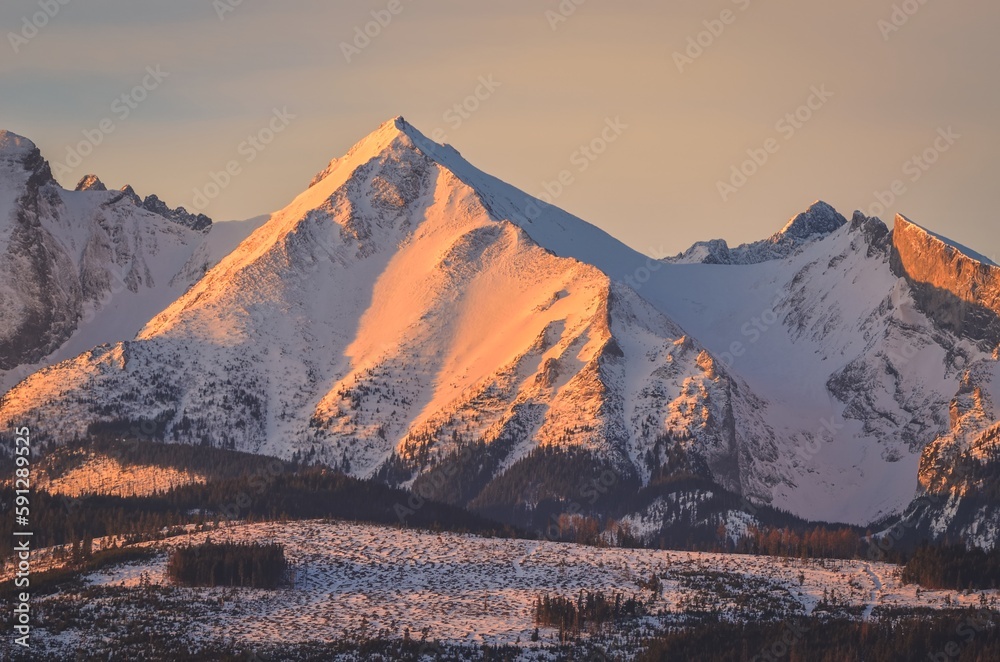 Charming panorama of the Polish Tatra Mountains in the morning. View of the Belianske Tatras from the village of Lapszanka, Poland.