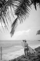 Rear view of a woman in a white cropped t-shirt with a yellow surfboard on the ocean.