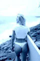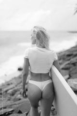 Rear view of a woman in a white cropped t-shirt with a yellow surfboard on the ocean.