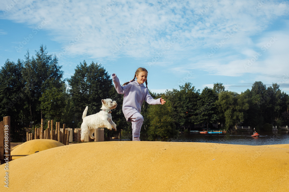 seven-year-old girl playing in the playground with her white puppy, sunny summer day