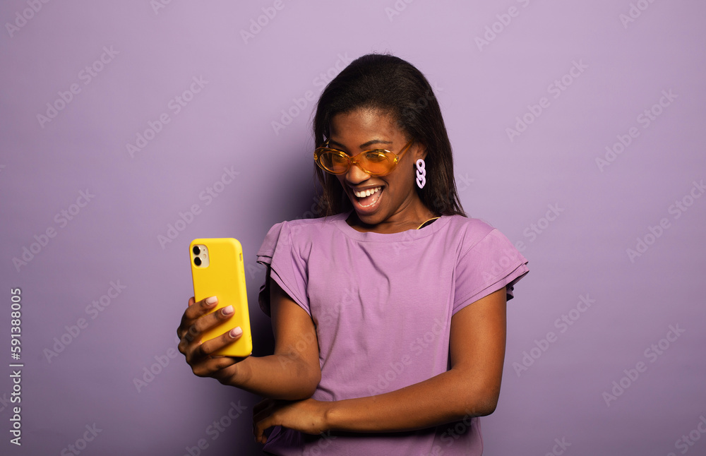 lifestyle, tehnology and people concept: Portrait of inspired dreamy american young surprised woman use her smartphone