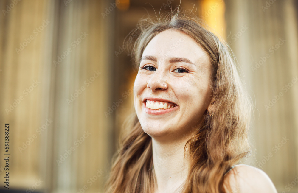 Close up Cheerful Blond Young Woman at the Street, Looking at the Camera with Toothy Smile.