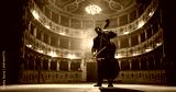 Cinematic shot of Male Cellist Playing Cello Solo on an Empty Classic Theatre Stage with Dramatic Lighting. Professional Musician Rehearsing Before the Start of a Big Show with Orchestra