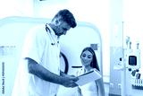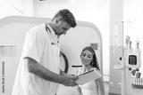 Female patient taking seat and asking questions about CT scan to crop medical practitioner after examination procedure in modern hospital