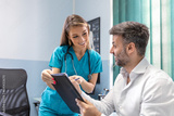 Young female professional doctor physician consulting patient, talking to adult man client at medical checkup visit. diseases treatment. medical health care concept