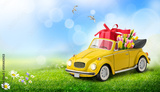 Yellow retro car with red gift box and tulip flowers on beautiful idyllic picture of nature.