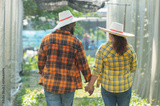 Two lover marriage farmer husband and wife walk holding hand together in greenhouse farm garden. husband and wife family touch holding hand together in green nature farm background.