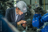 male automation engineer in uniform helmet safety inspection check control heavy machine robot arm system in industrial factory. technician worker check for repair factory machine