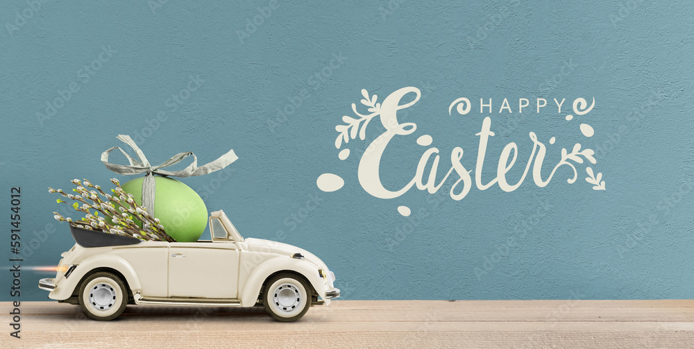 Retro cabrio car carrying an easter egg . Happy Easter text