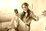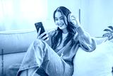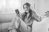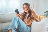 Happy asian woman listening to music from mobile phone while sitting on the the sofa at homes, Smiling girl relaxing with headphones in morning, Time to relax. copy space.