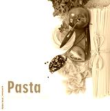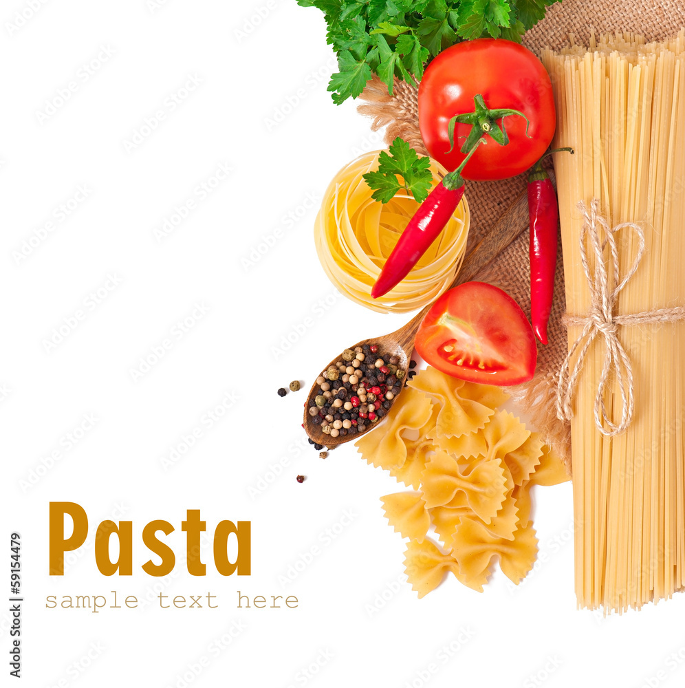 Pasta spaghetti, vegetables, spices and oil, isolated on white