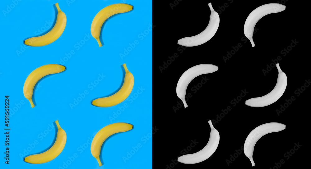 Collage of banana on the blue and black background. Flat lay. Pattern. Top view.
