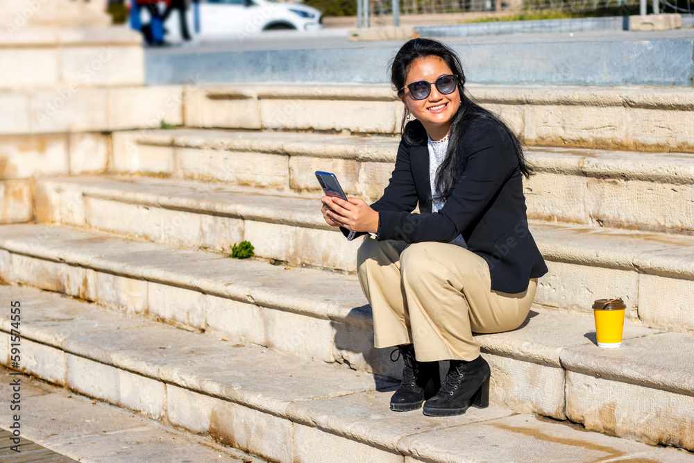 Asian businesswoman sitting on a staircase consulting the phone