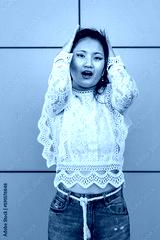 Asian pretty girl caught with her hands on her head and her mouth wide open