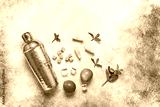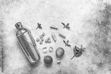 Mojito ingredients. Shaker, lime, mint leaves, cane sugar and ice cubes on a gray vintage background. Top view, flat lay, copy space.