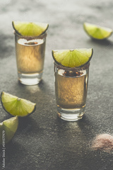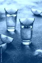 Tequila shot glass with lime and pink salt. Side view, selective focus. Toned image.