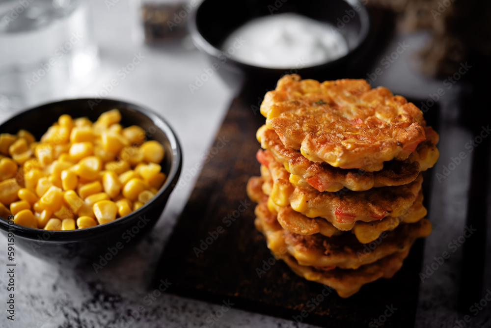 Corn fritters in a plate with sour cream sauce