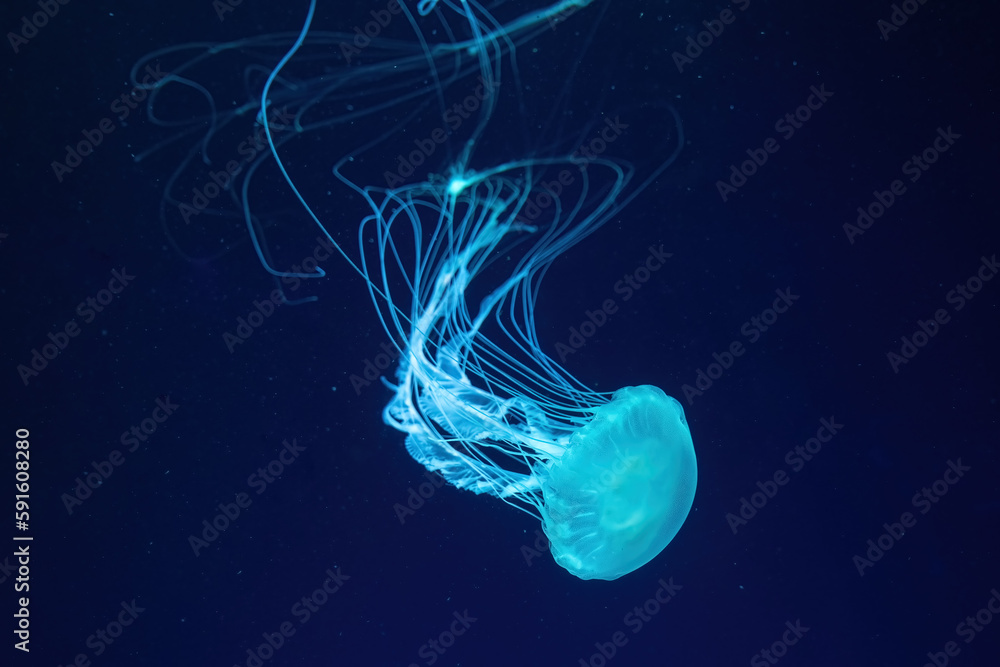 Fluorescent jellyfish swim underwater in aquarium pool with blue neon light. The Atlantic sea nettle chrysaora quinquecirrha in blue water, ocean. Theriology, tourism, diving, undersea life.