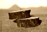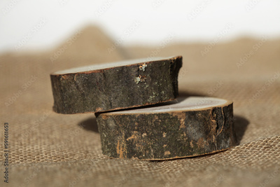 Wooden eco rustic pine tree wood circle disc platform podium on canvas background. Minimal empty display product presentation scene.