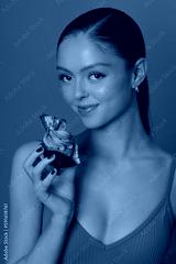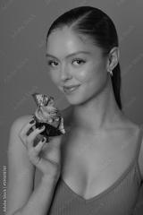 Portrait of beautiful young happy girl eating cake, close up. Chocolate background. Smiling girl playing with dessert.