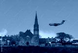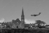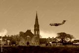 Atlas RAF aircraft carrier flying over the town of Lossiemouth and past the church spier as it comes in to land at RAF Lossiemouth