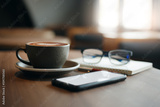 Close-up view, white cup of coffee with smartphone, notebook, pen and eye glasses on wooden table near bright window in cafe. Vintage light, blurred background