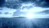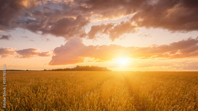 Scene of sunset on the field with young rye or wheat in the summer with a cloudy sky background.