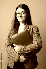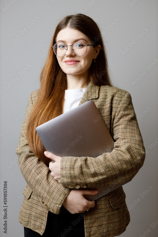 Vertical portrait of a young smiling woman in glasses and a jacket with a laptop in her hands on a gray background.