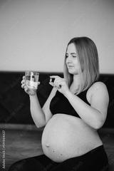 Pregnant woman take vitamins daily Omega 3 and glass water. Female hands hold supplements or vitamin. Girl sitting in bed at home. Pregnancy, treatment, medicine healthcare concepts. Photo of pills.