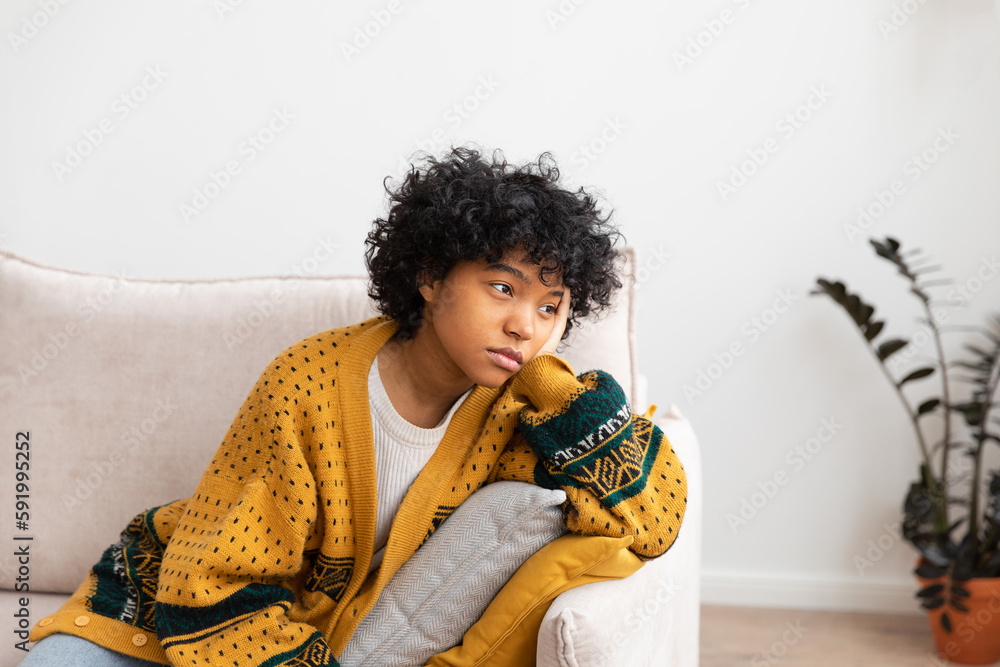 African american sad thoughtful pensive unmotivated girl sitting on sofa at home indoor. Young african woman ponder look tired after long day. Girl feels depressed offended lonely upset heartbreak