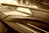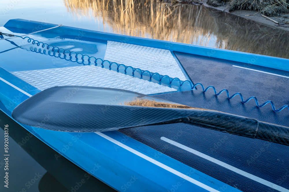 wet paddle and a coiled safety leash on a deck of stand up paddleboard