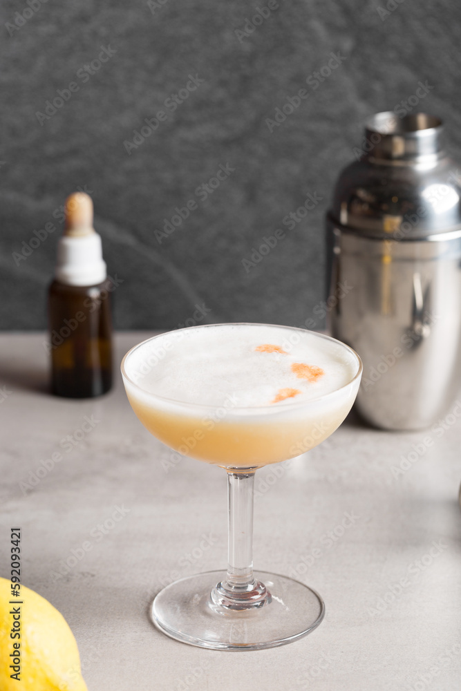 Whiskey Sour cocktail booze bourbon whiskey, lemon juice, simple syrup, egg white and aromatic bitters