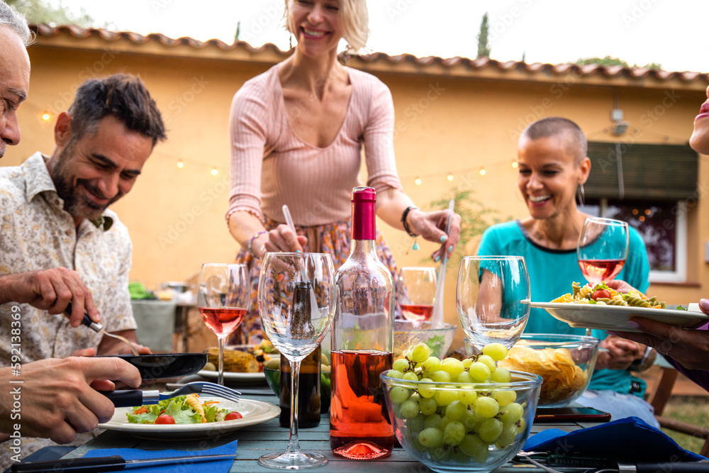 Caucasian woman serving salad to friends during outdoor garden dinner party. Friends having fun. Focus on foreground.