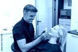 Patient's teeth shade with samples for bleaching treatment.Viewed oral hygiene. Woman at the dentist. Woman in the dental chair dental treatment during surgery.