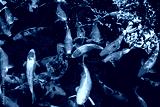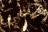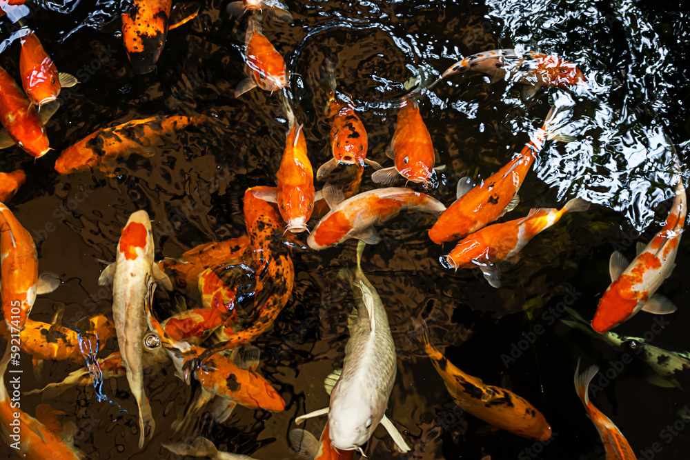 Japan koi fish or Fancy Carp swimming in a black pond fish pond. Popular pets for relaxation and feng shui meaning.
