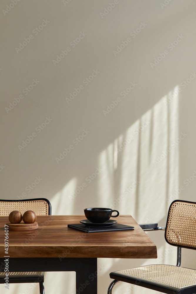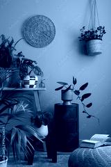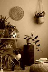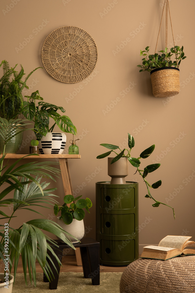 Warm and cozy composition of living room interior with plants in flowerpots, wooden bench, black stool, stylish pouf, green sideboard, books and personal accessories. Home decor. Template.