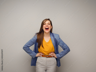 Portrait of excited smiling woman in blue suit and yellow shirt.