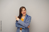 Smiling woman in blue business suit pointing finger at side, isolated female portrait.