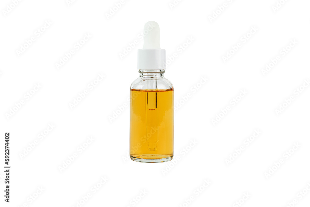 A dropper bottle with yellow vitamin C serum or oil standing on a white background. An isolated item