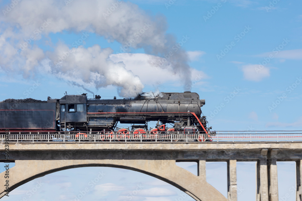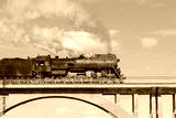 A smoking steam locomotive driving over an old bridge against a blue sky