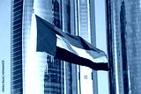 united arab emirates (uae) national flag waves on air in the sky in front of tall buildings in abu dhabi